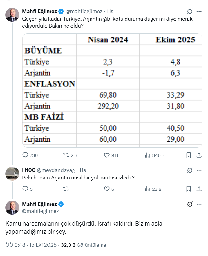 Eğilmez, bir takipçisinin “Peki hocam Arjantin nasıl bir yol haritası izledi” sorusuna ise “İsrafı kaldırdı. Bizim asla yapamadığımız bir şey” ifadelerini kullandı.